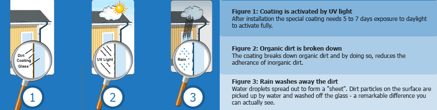 Το αυτοκαθαριζόμενο γυαλί προσφέρει μια καινοτόμο λύση στη μείωση των καθαρίζοντας λογαριασμών σας των προσόψεων δεδομένου ότι θα μείνει καθαρό περισσότερο και θα επιτρέψει τον ευκολότερο καθαρισμό όταν απαιτείται. Μειώνω τη συντήρηση καθαρισμού παρά πολύ από αυτοκαθαριζόμενο μέσω των φυσικών στοιχείων όπως οι υπεριώδη (UV) ακτίνες και το νερό του ήλιου. Το UV φως αναλύει τον οργανικό ρύπο στο γυαλί, ενώ τα όμβρια ύδατα πλένουν μακριά το ρύπο.